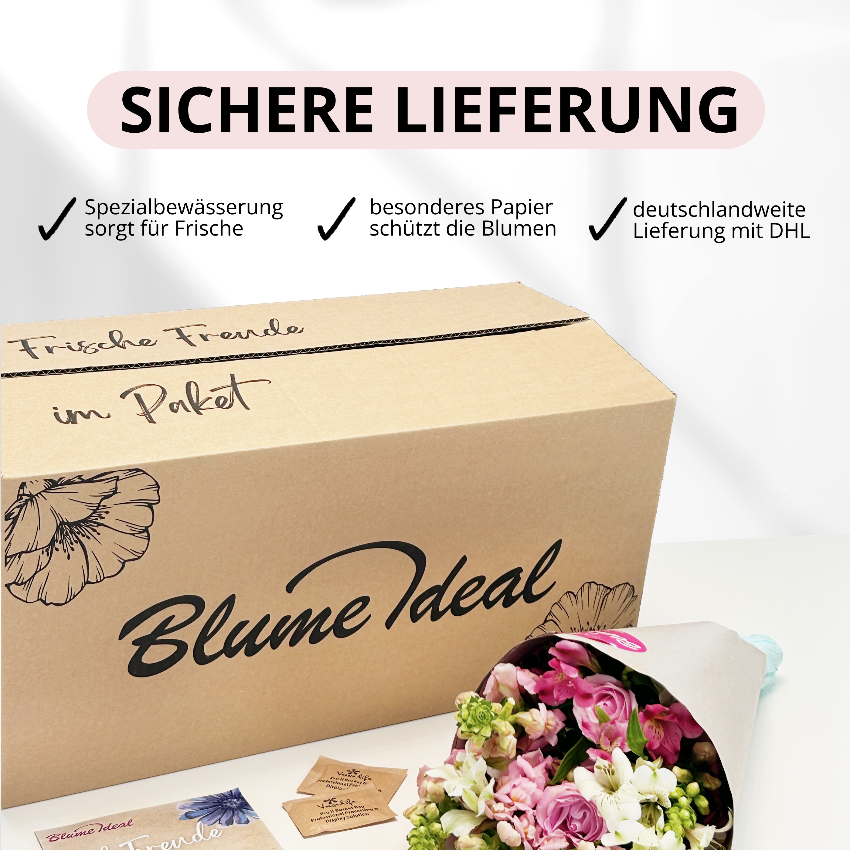 • Extras: Spezieller Blumenversandkarton mit Wasserversorgung durch eine Frischetüte
