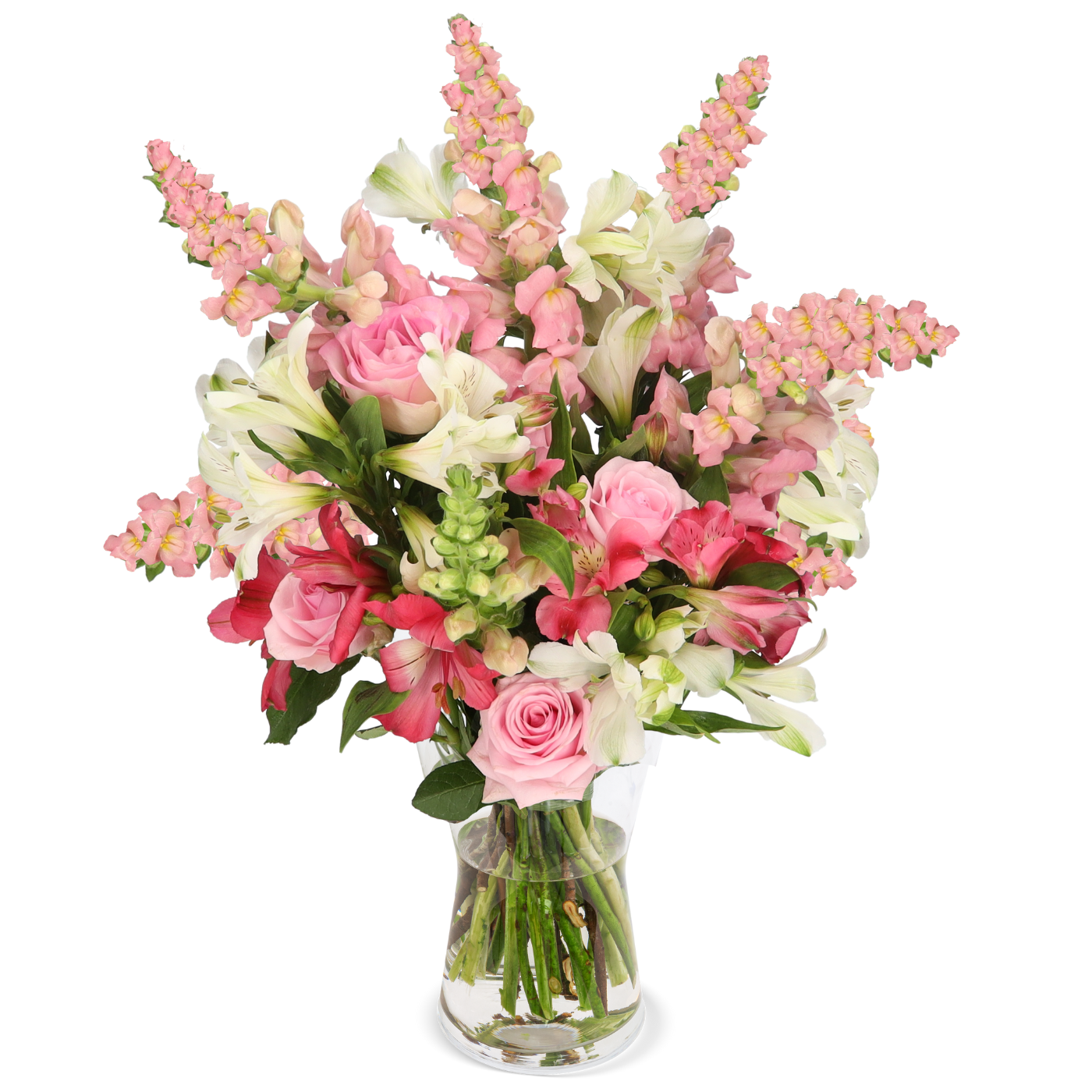 • Inhalt: 20 Stiele (6 Pinke Rosen, 5 Levkojen, 9 Alstroemeria)