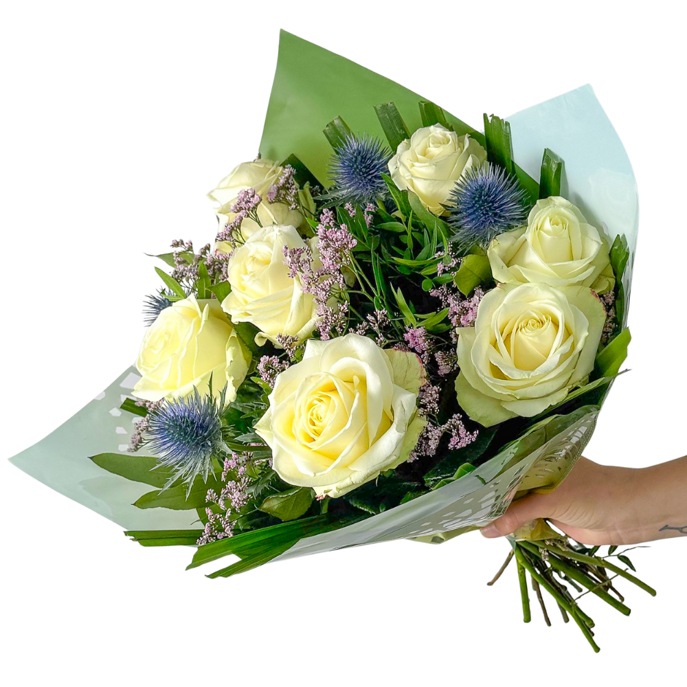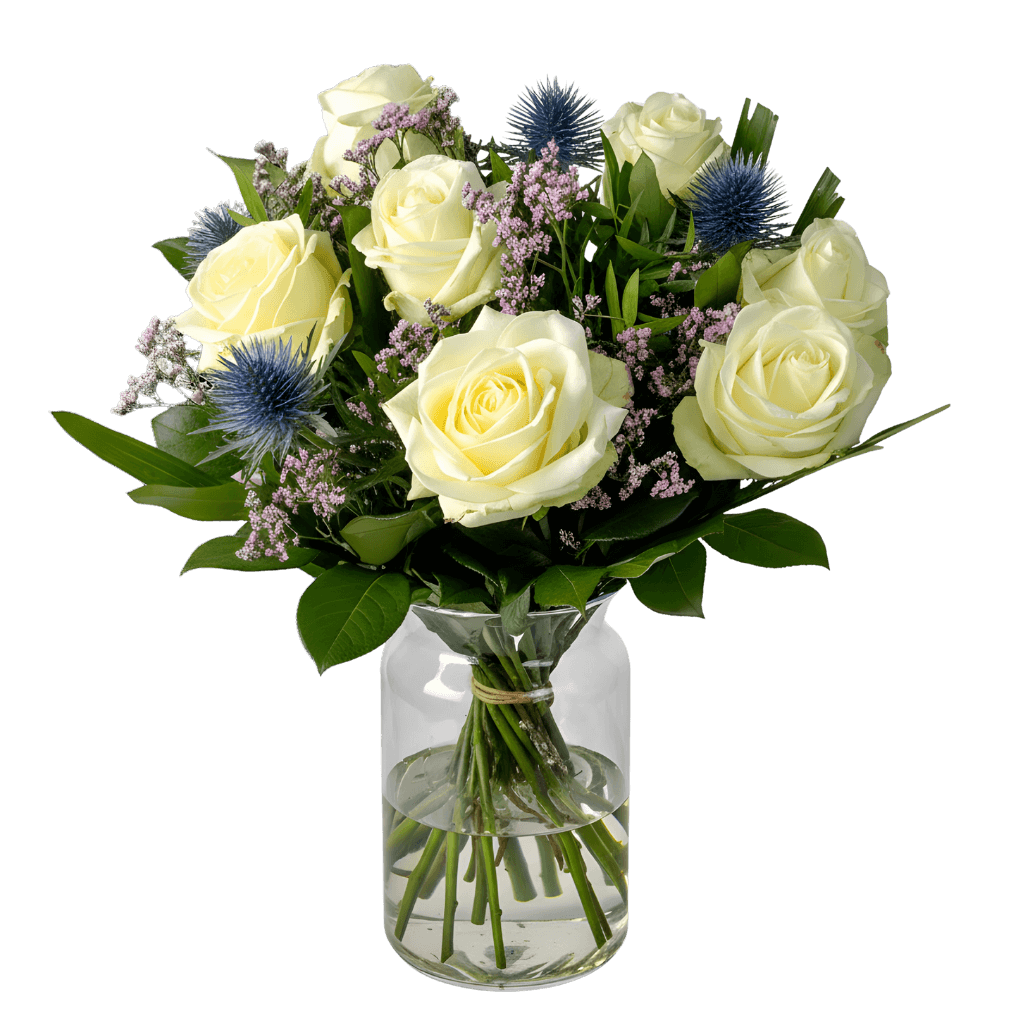 Der herrliche Blumenstrauß "Sanfte Harmonie" ist eine florale Komposition, die nicht laut sprechen muss, um gehört zu werden. Schon beim ersten Anblick wirkt das Zusammenspiel aus elfenbeinweißen Rosen, Schleierkraut und feinem Blattgrün wie ein stilles Versprechen – von Ruhe, Achtsamkeit und echter Wertschätzung. Die edlen, voll erblühten Rosen verleihen dem Bouquet eine klassische Eleganz, während die stacheligen Distelblüten in einem kühlen Blau-Violett einen spannungsvollen Kontrast setzen. Umrahmt von frischem Grün und feinen Texturen wirkt der Strauß wie ein verführerischer Moment der Stille in einer lauten Welt – zurückhaltend, aber voller Ausdruck.Stille Schönheit in vollendeter Form