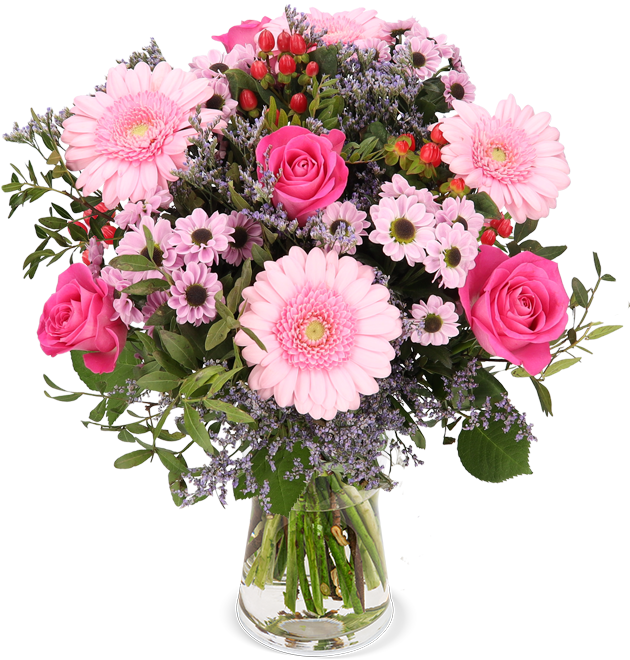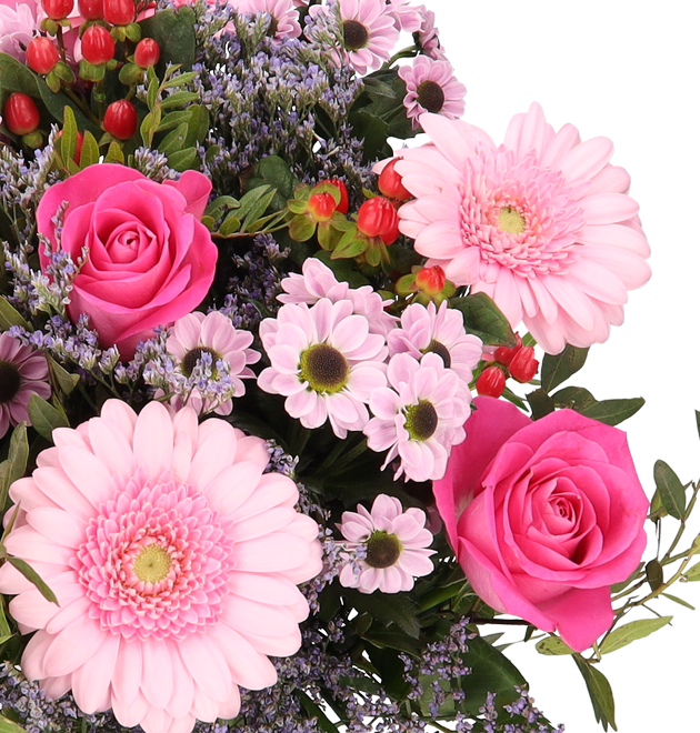 - Inhalt: 20 Stiele (4 Pinke Rosen, 4 Santini "Chrissie", 4 Rosa Gerbera, 2 Hypericum, 2 Statice, 4 Pistacia)